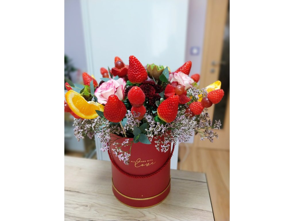 Flower box o průměru 13-15cm aranžovaný květinami a čerstvým ovocem.