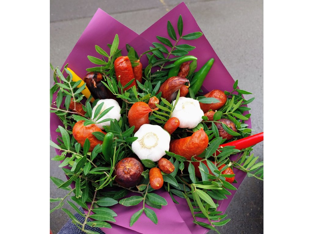 Klobásová kytice vázaná z klobás, salámků, mini salámků a feferonek doplněná zelení.