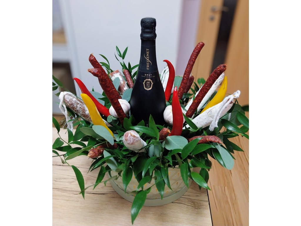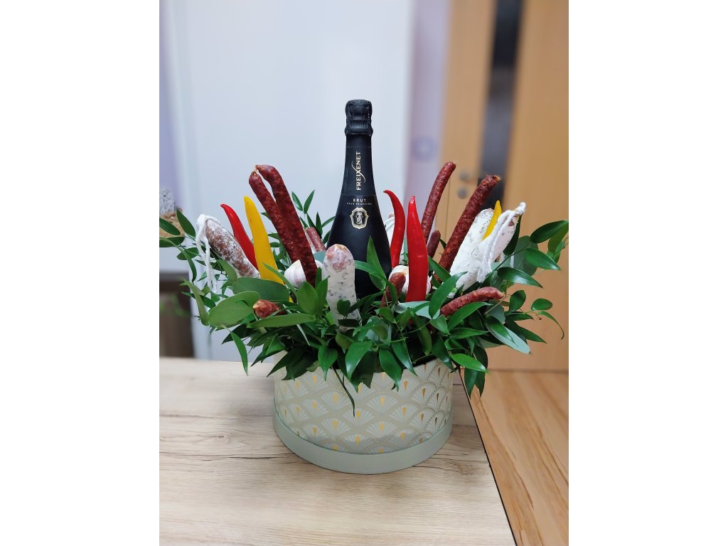 Box je tvořený z klobás, mini salámků, salámků z vepřového masa, feferonek, doplňkové zeleně a vína, frizzante nebo prosecca.
