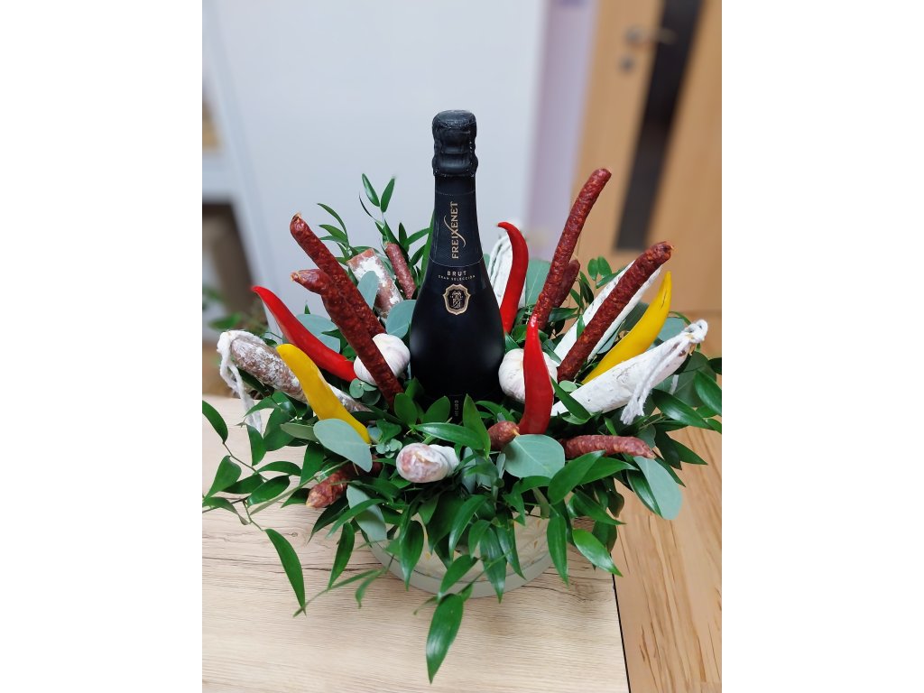 Box je tvořený z klobás, mini salámků, salámků z vepřového masa, feferonek, doplňkové zeleně a vína, frizzante nebo prosecca.
