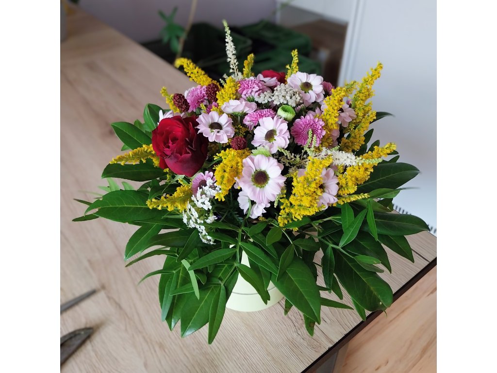 Flower box o průměru 13-15cm aranžovaný květinami a doplňkovou zelení.