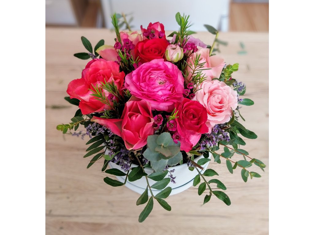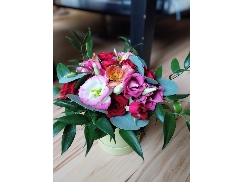 Flower box o průměru 22-25cm aranžovaný květinami a doplňkovou zelení.