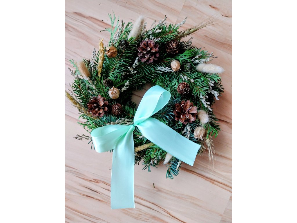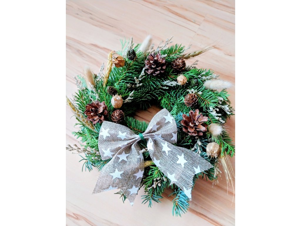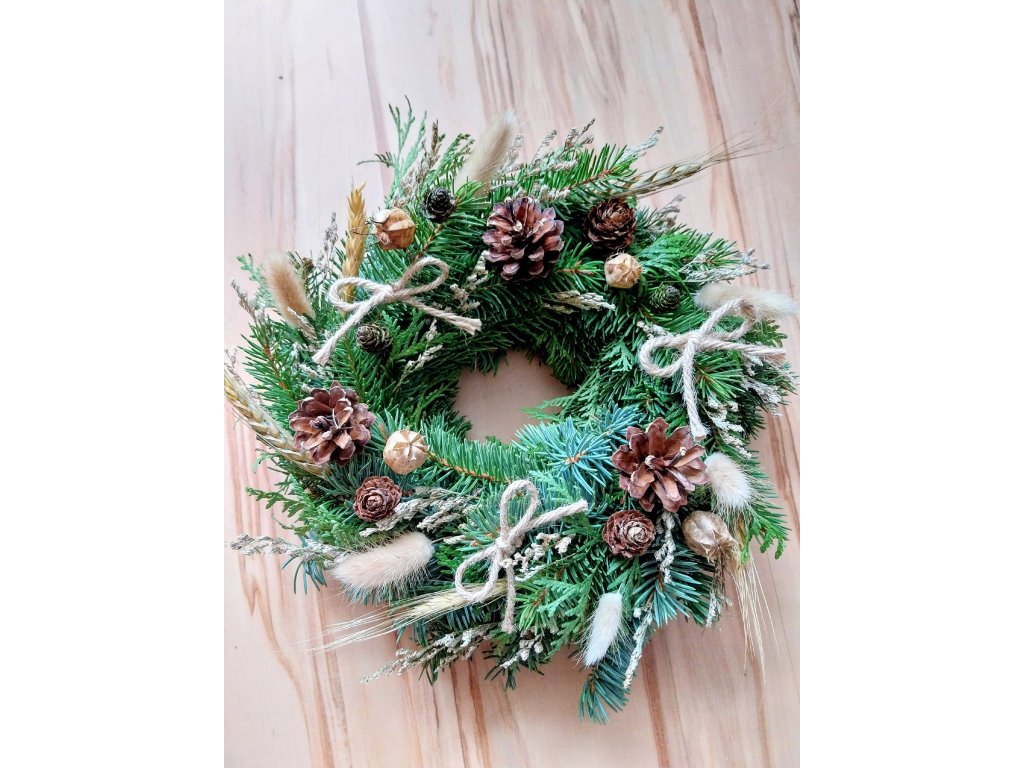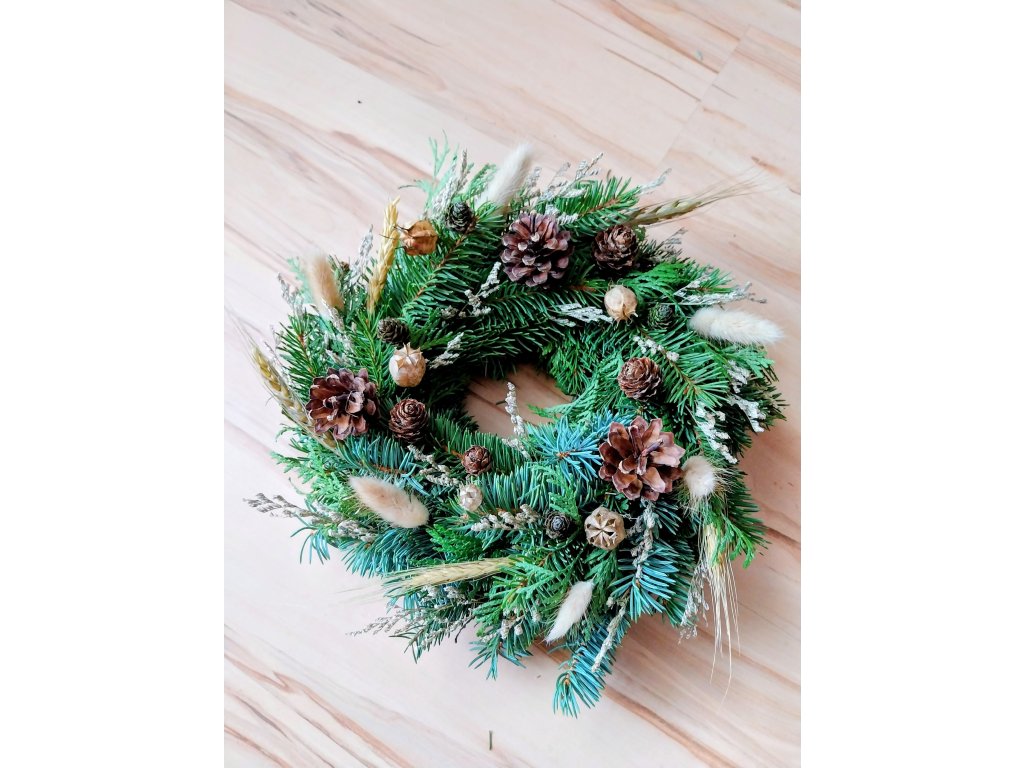Věnec z přírodního chvojí, sušin, šišek a plodů.