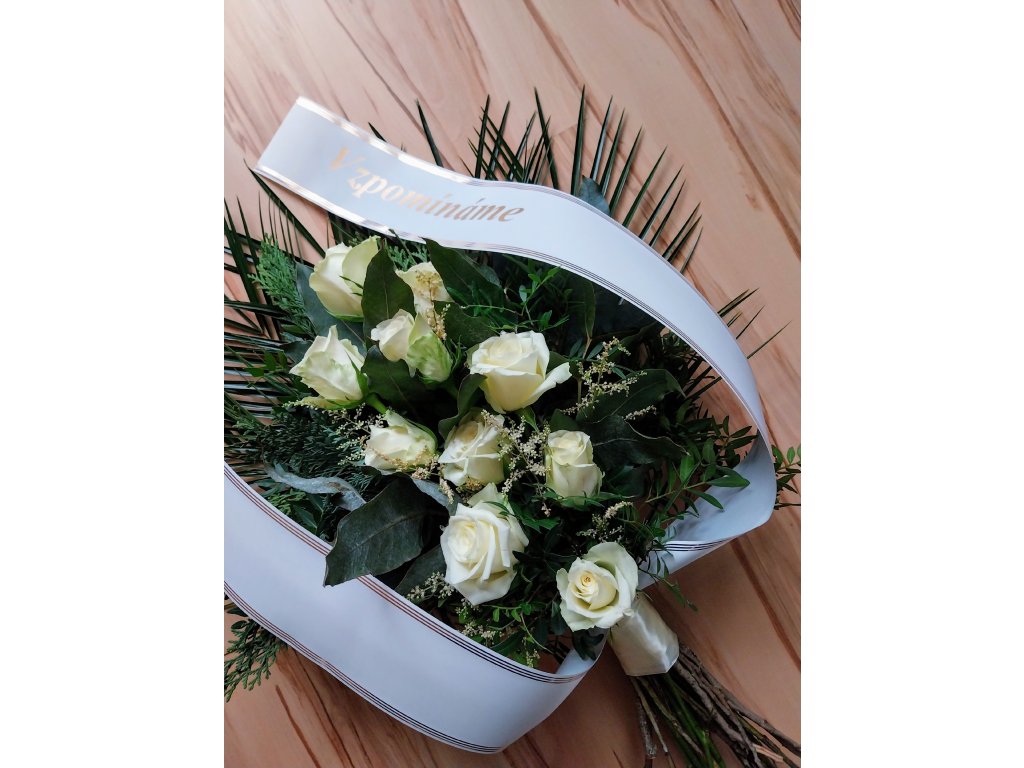 Smuteční kytice je tvořena ze 4-6 květin, která je doplněná přírodní zelení (aspidistra, palmové listy apod.). Z nabídky si můžete vybrat různé barvy a černou nebo bílou stuhu s vlastním textem, který prosím napište v objednávce do poznámky.