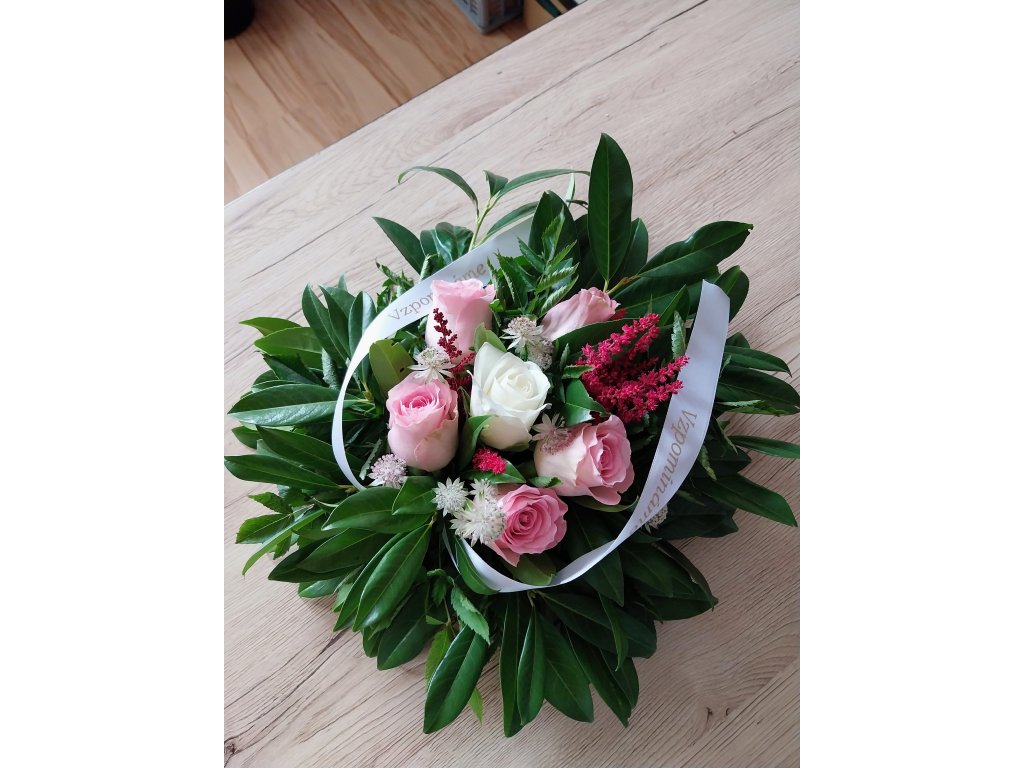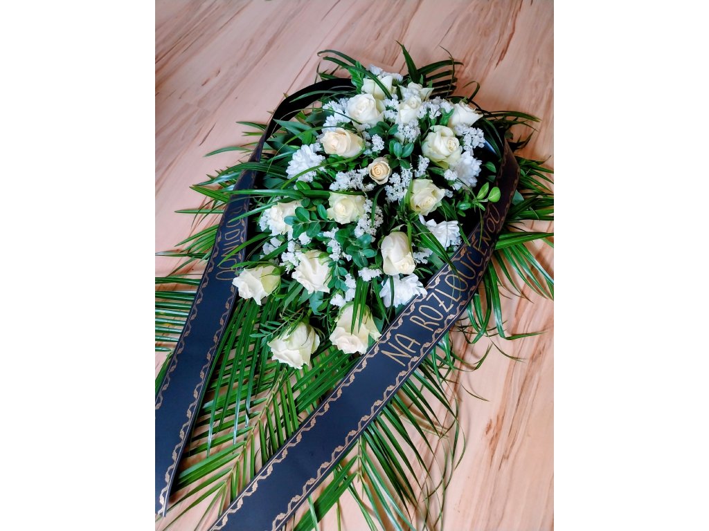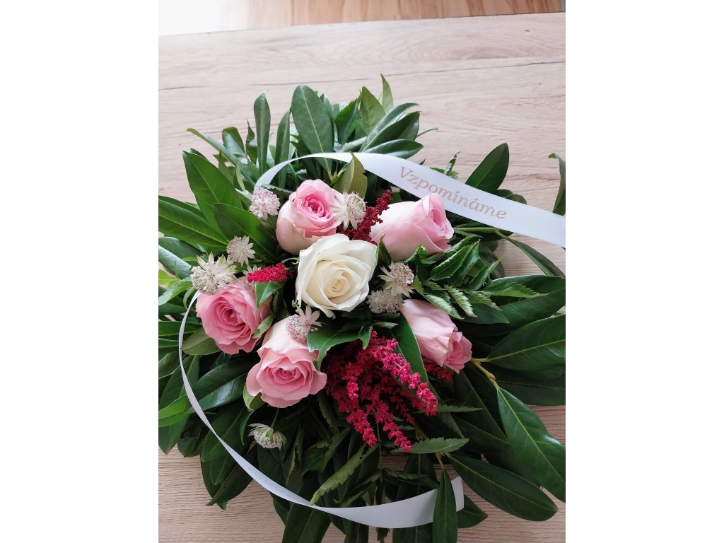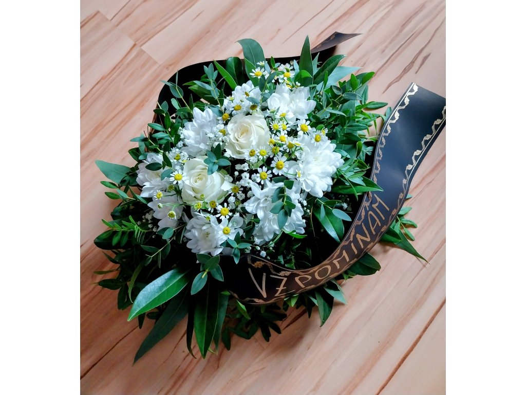 Smuteční kytice je tvořena z několika květin, která je doplněná přírodní zelení. Z nabídky si můžete vybrat různé barvy a černou nebo bílou stuhu s vlastním textem, který prosím napište v objednávce do poznámky.