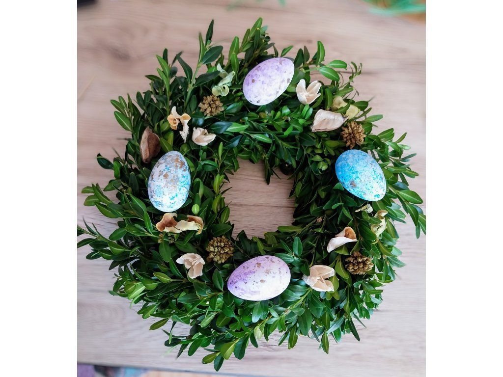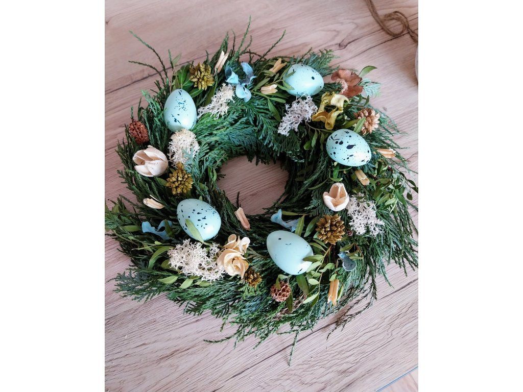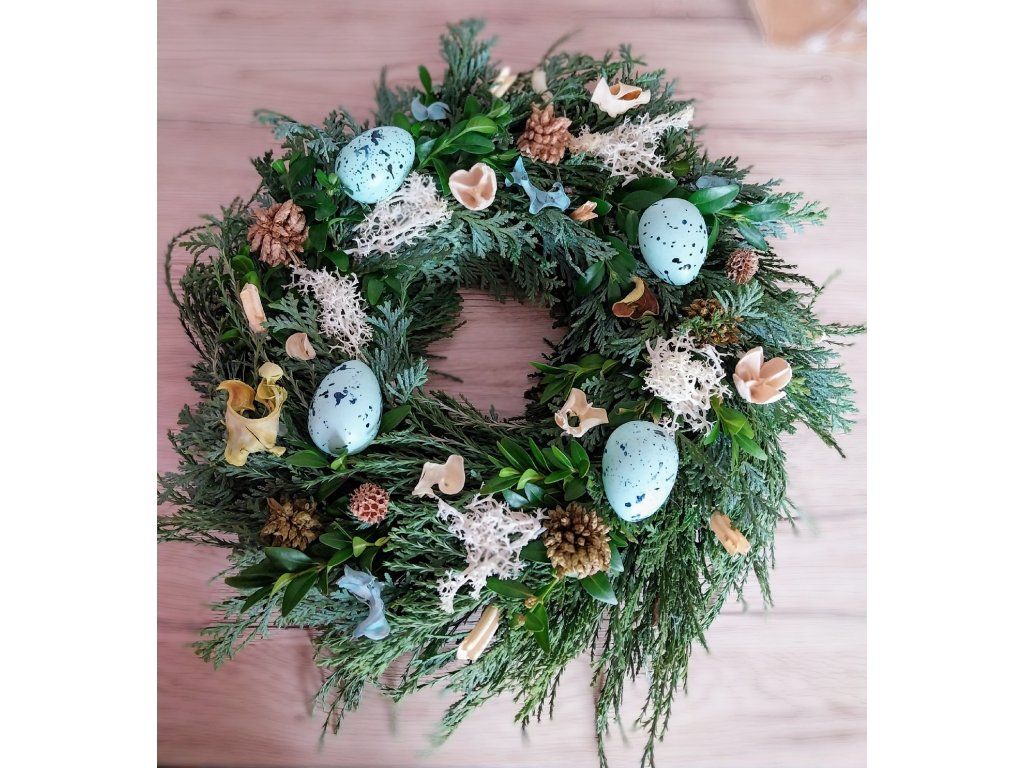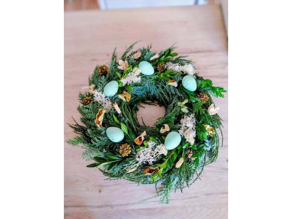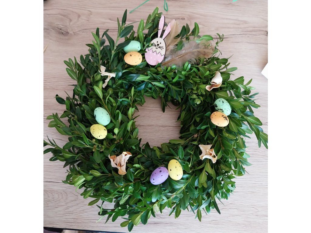 Věnec tvořený z jarní zeleně a drobných jarních nebo velikonočních ozdob. Při objednávce do poznámky upřesněte, jaký druh ozdob na věnec budete chtít.