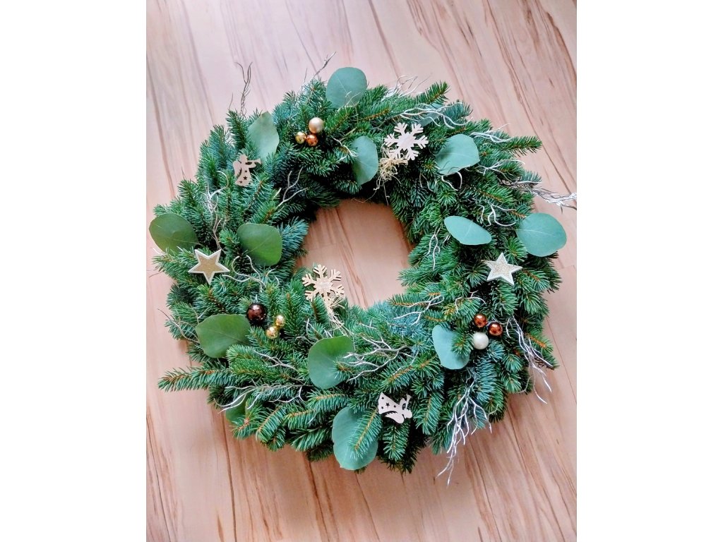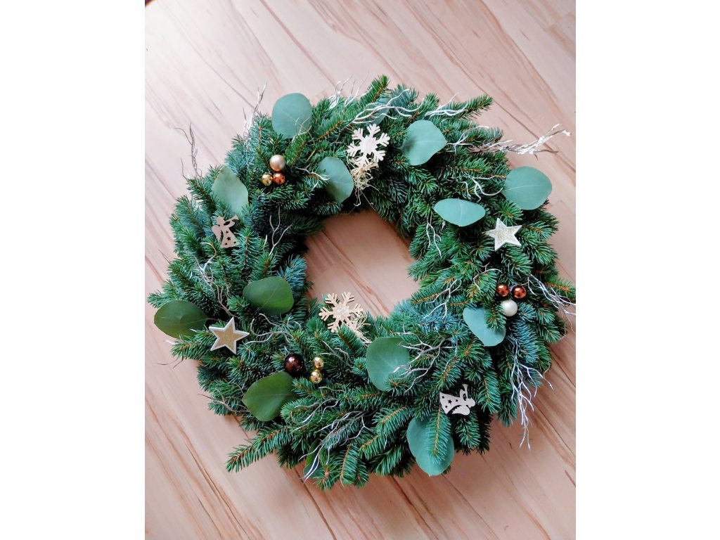 Věnec z přírodního chvojí doplněný eucalyptem, pistacií a drobnými ozdoby.