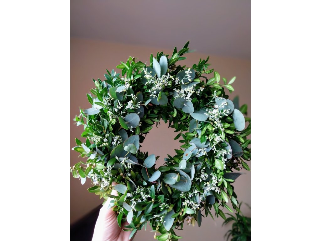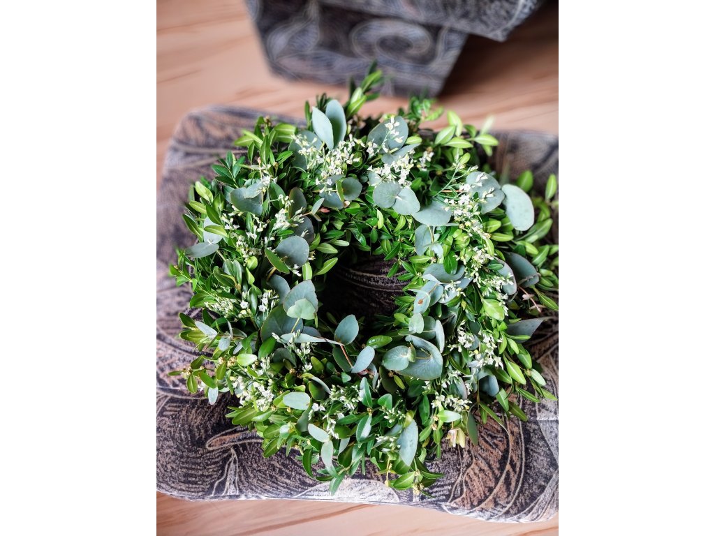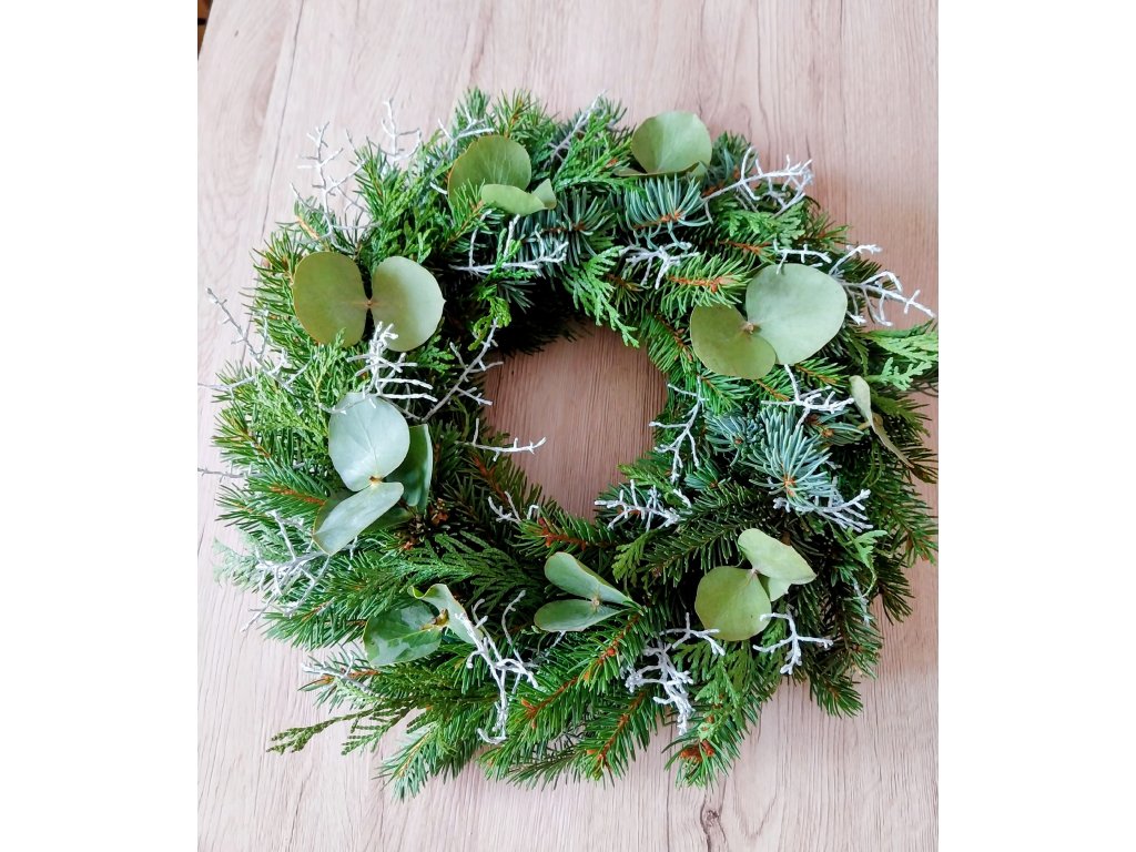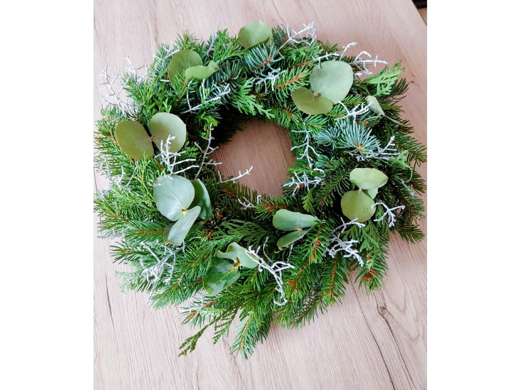 Věnec z přírodního chvoji, doplněný eucalyptem, limoniem nebo drátovcem.