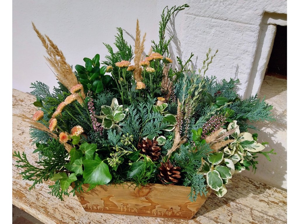 Aranžmá budete vypichovat do dřevěné misky, dřevěného truhlíku nebo proutěného košíku. Dekoraci si vypíchnete do aranžovací hmoty ze sezónních květin nebo z přírodního materiálu - pistache, eucalyptus, buxus, tuje, sušiny, plody a můžete si je doplnit drobnými jarními/velikonočními ozdobami.